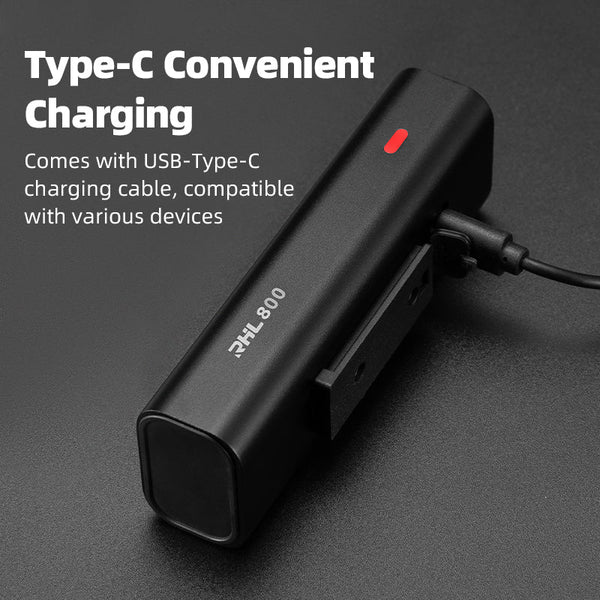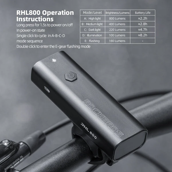 Illuminate your rides with the Rockbros RHL800 Front Light, the bright, compact, and budget-friendly 800-lumen USB rechargeable bike headlight for daily commuters, gravel explorers, urban cyclists, and trail riders seeking strong visibility, long runtime, solid waterproofing, and great value. This aluminum-bodied light delivers up to 800 lumens (high mode) with a balanced beam combining focused forward throw (up to 150–180m) and wide peripheral flood to light up dark roads, paths, or trails effectively. Featuring 5 modes (high/medium/low/strobe/SOS), quick USB-C charging (built-in 2200–2600mAh battery), IPX6 waterproof rating, and tool-free handlebar mount (fits 22–35mm bars), it’s easy to attach/remove and built to withstand rain, dust, and bumps. Weighing just ~110–130g with an anti-slip bracket and heat-dissipating fins, it’s lightweight yet durable for everyday use. More than just a light—it’s your dependable, high-value night companion for safer commuting, early starts, dusk adventures, and low-light confidence without premium cost.